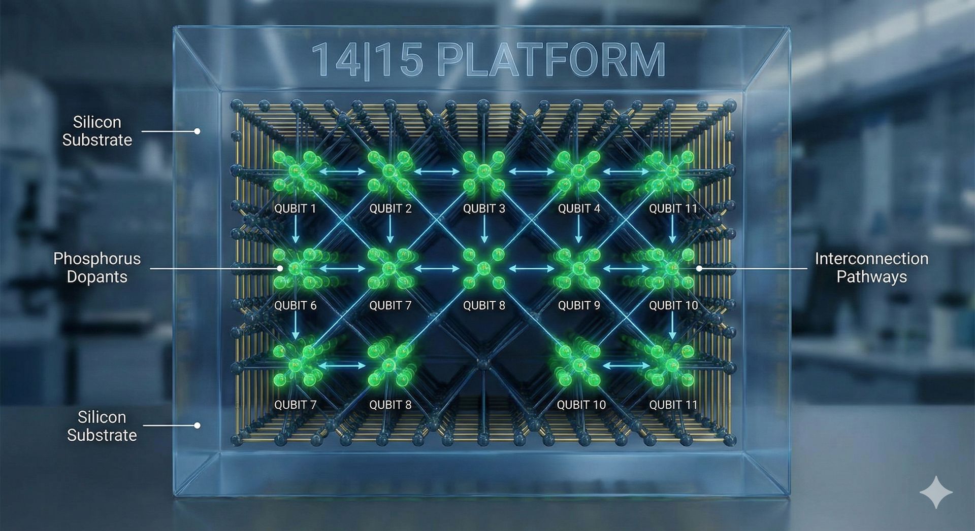Illustration of the "14|15 platform" showing phosphorus atoms within silicon, highlighting the 11 linked qubits. (Generated by AI)